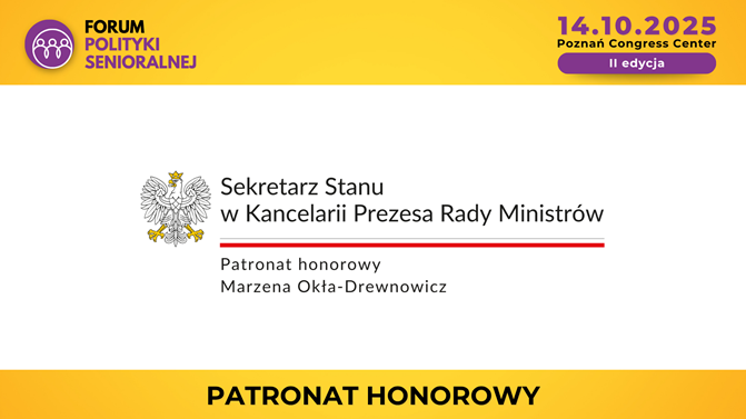 Forum Polityki Senioralnej zostało objęte Patronatem Honorowym Marzeny Okły-Drewnowicz, Sekretarz Stanu w Kancelarii Prezesa Rady Ministrów, Pełnomocnik Rządu ds. Polityki Senioralnej.