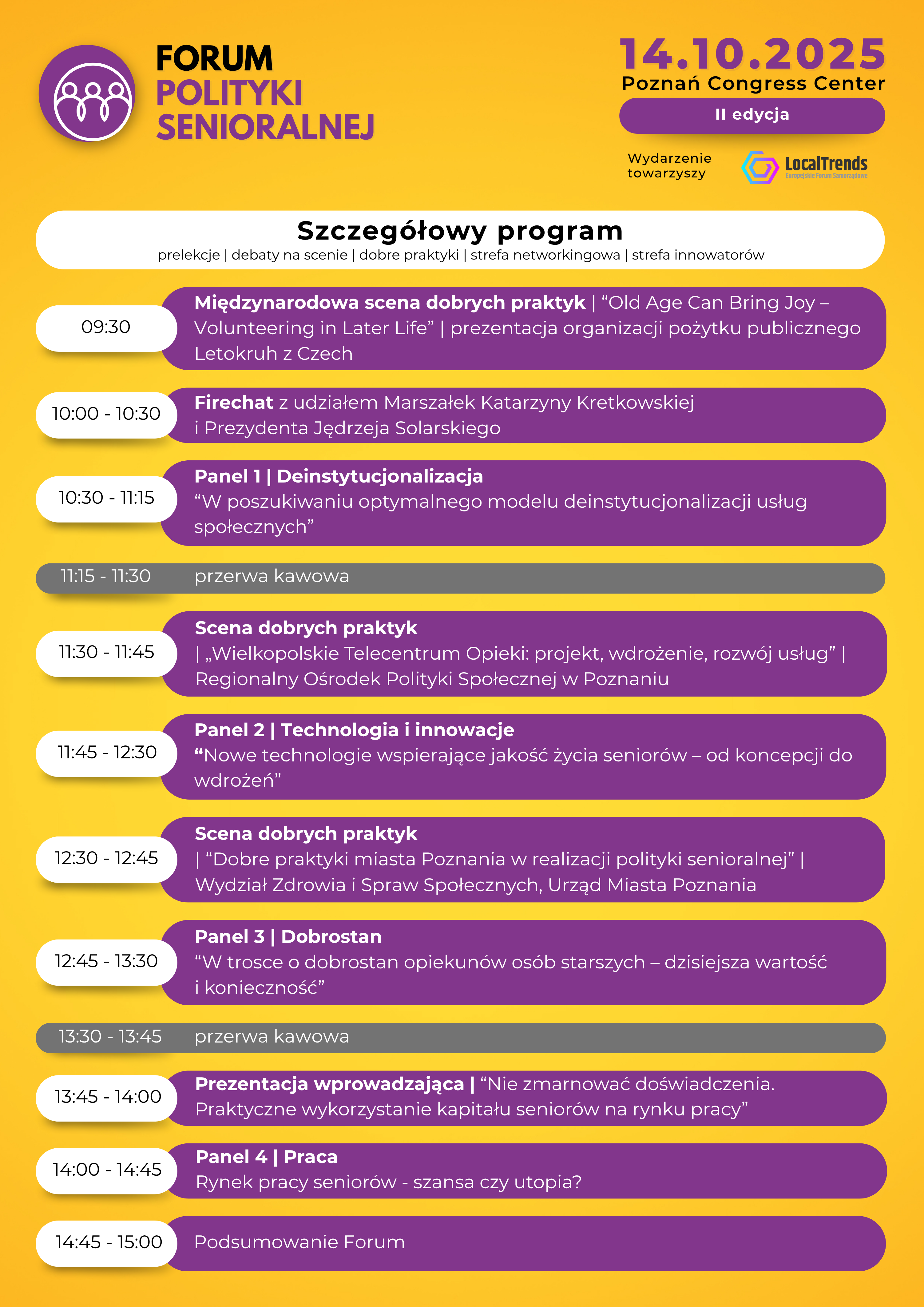Agenda wydarzenia Forum Polityki Senioralnej jest konsultowana oraz opracowywany wraz z Radą Programową - Fundacji In_Spire, Regionalnego Ośrodka Pomocy Społecznej w Poznaniu, Centrum Myśli Strategicznych oraz Grupą MTP. Forum Polityki Senioralnej uzupełnia program Local Trends o specjalną ścieżkę tematyczną opierającą się na polityce senioralnej i wymianie dobrych praktyk pomiędzy samorządami.