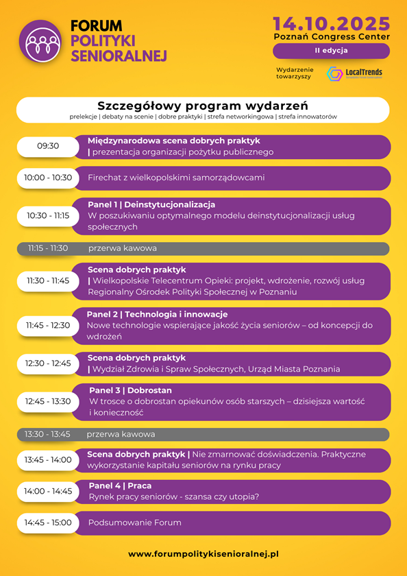 - 14 października – dzień główny Forum Polityki Senioralnej – prelekcje i debaty z ekspertami na scenie, prezentacja dobrych praktyk, Forum w dialogu – Strefa Innowatorów i Strefa Networkingowa przeznaczone na spotkania indywidualne i wymianę doświadczeń – udział tego dnia jest kluczowy, aby w pełni skorzystać z programu.